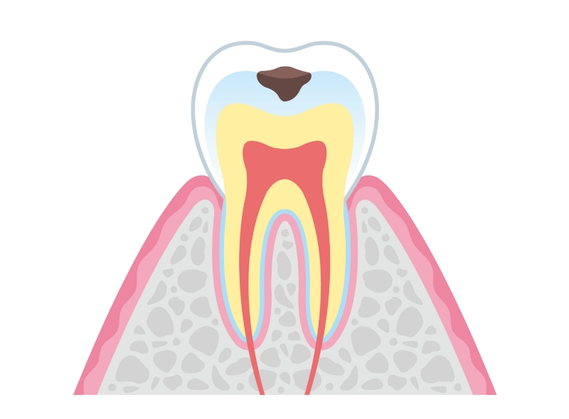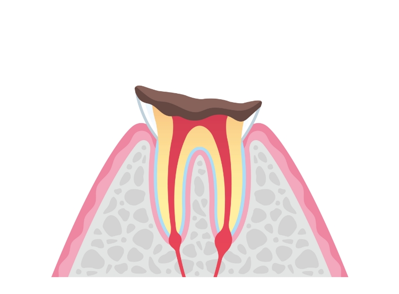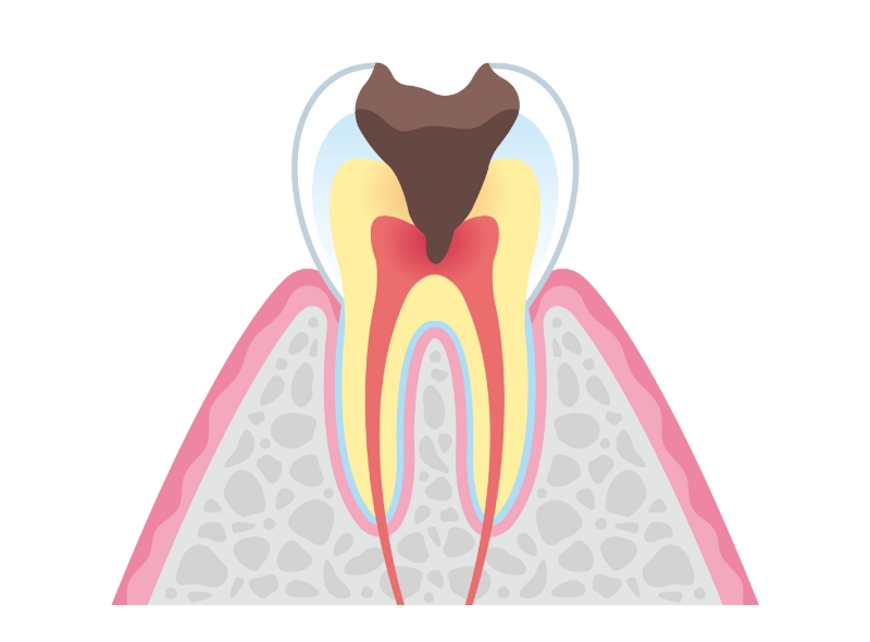虫歯が象牙質まで到達すると、神経に近い部位まで細菌が侵入します。象牙質は神経との距離が近いため、温度変化などの刺激で痛みを感じやすくなるのが特徴です。この段階では、虫歯を除去し、適切な詰め物や被せ物で歯を保護しなければなりません。症状によっては、神経の除去(抜髄)が必要になるケースもあります。